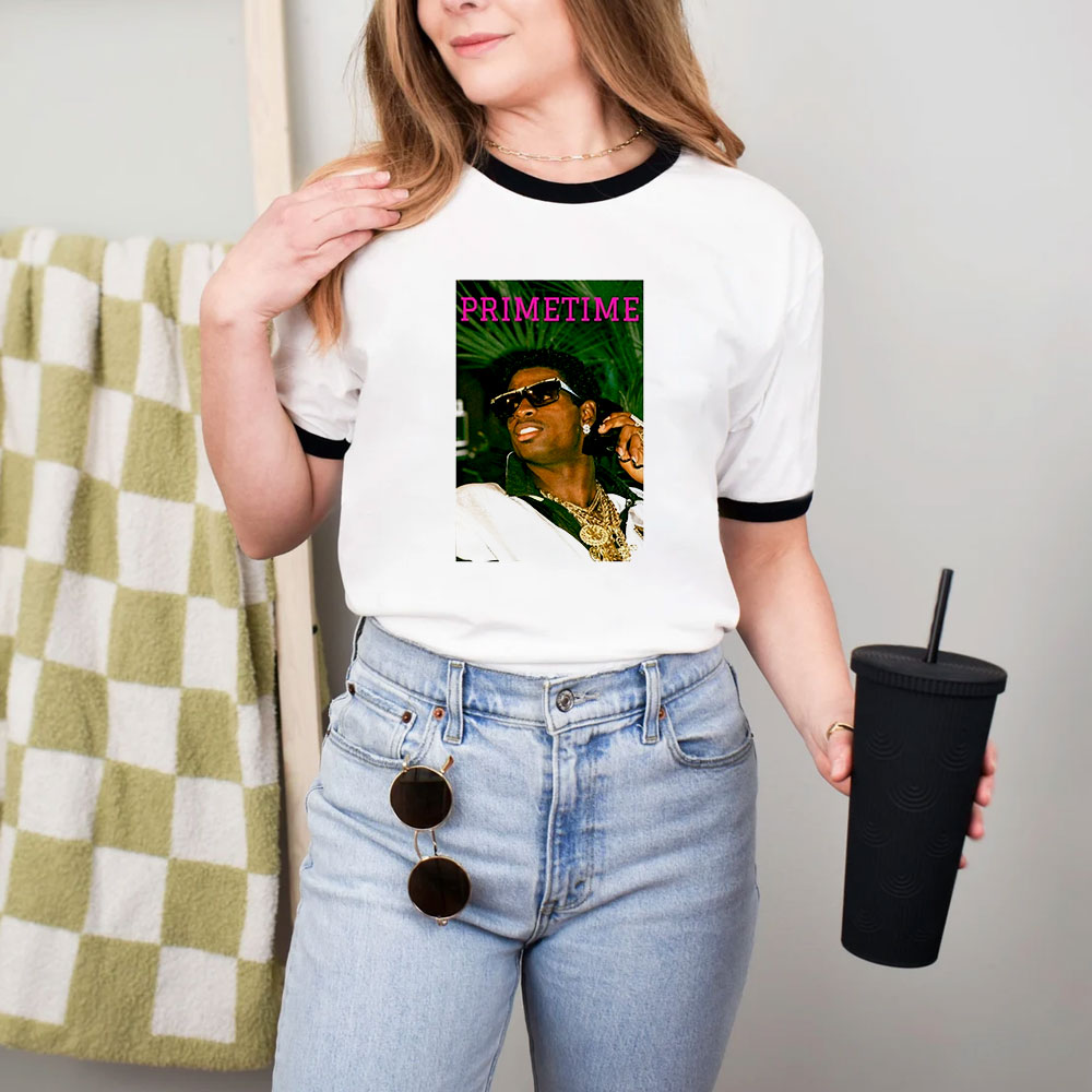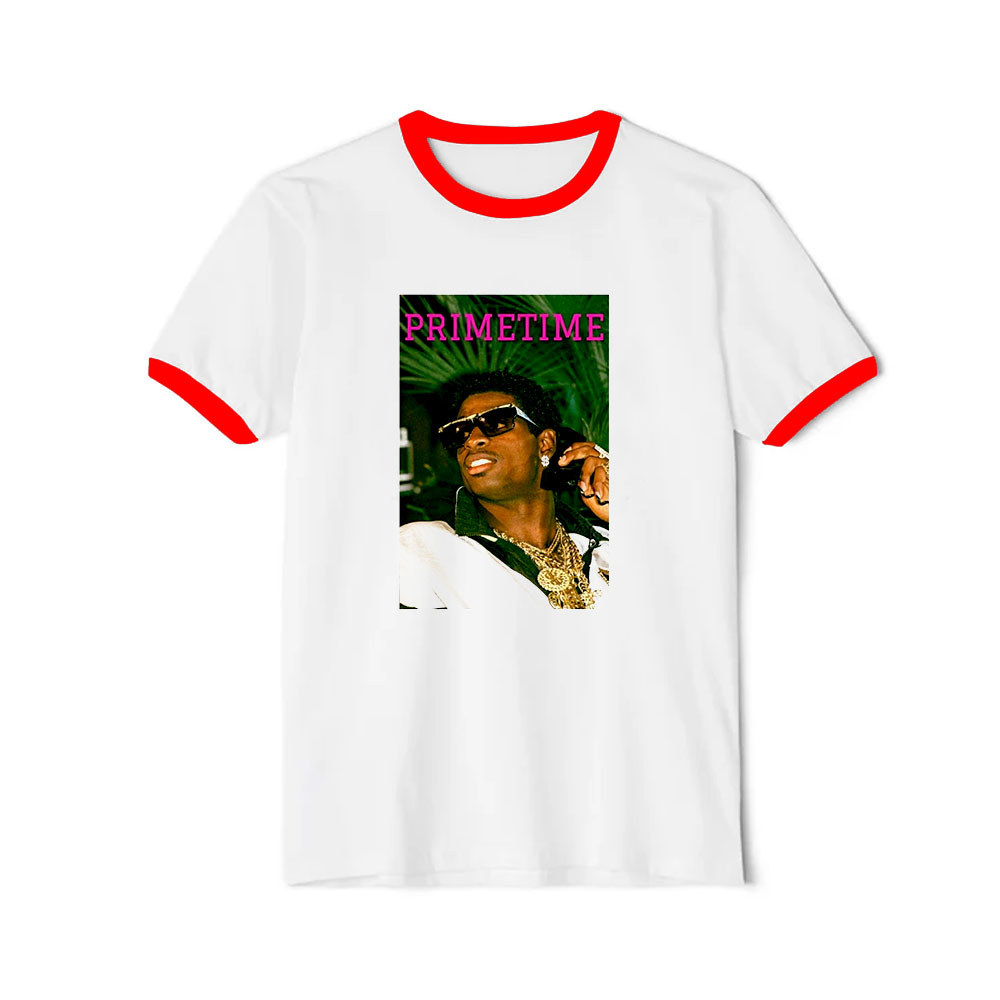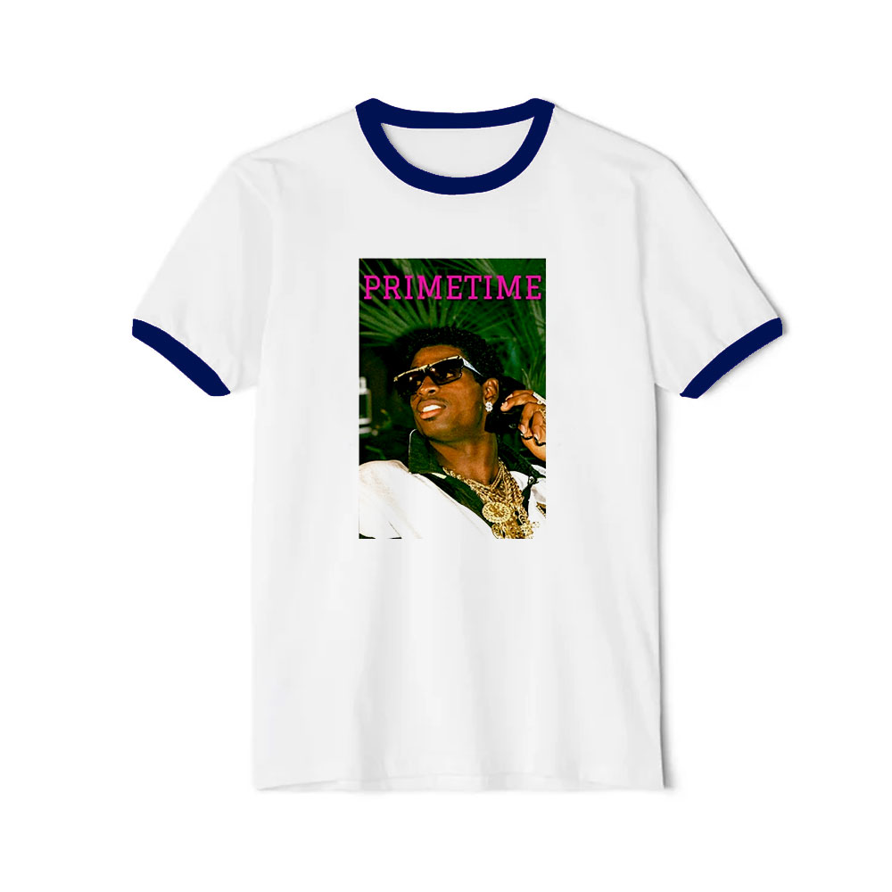 We believe that even novelty shirts deserve to be comfortable.Jc On Deion Sanders Deion Primetime Sanders Ringer Tee digitally printed with the latest and greatest in direct to garment printing. Digital printing delivers a smooth and soft finish that will not crack or fade. The shirts are handmade to order using only the finest quality, longest-lasting, environmentally friendly inks.